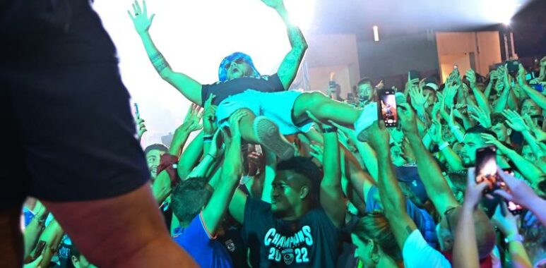 Une soirée gratuite ouverte à tous, avec un DJ, le chanteur Roland Ramade et la présence des rugbymen vers 21h30. Quel plaisir déjà de toucher et de porter le bouclier de Brennus. En toute liberté. De se prendre en photo avec. De voir qu’il n’est pas encore gravé pour cette année mais que les dirigeants ont mis un bout de sparadrap avec écrit dessus 2022 MHR. Quel plaisir de porter les champions de France en triomphe, à l’image de Benoît Paillaugue, de Fufu ou du géant sud-africain, Van Rensburg. Entre paquito basque et concert de rock. Quel kif de passer des moments dignes des plus grandes férias avec NGandebe, Chalureau, Verhaeghe. De finir arrosé de bière par Bouthier, Rattez et Vincent, dans une immense chenille. Des moments aussi rares que précieux.
